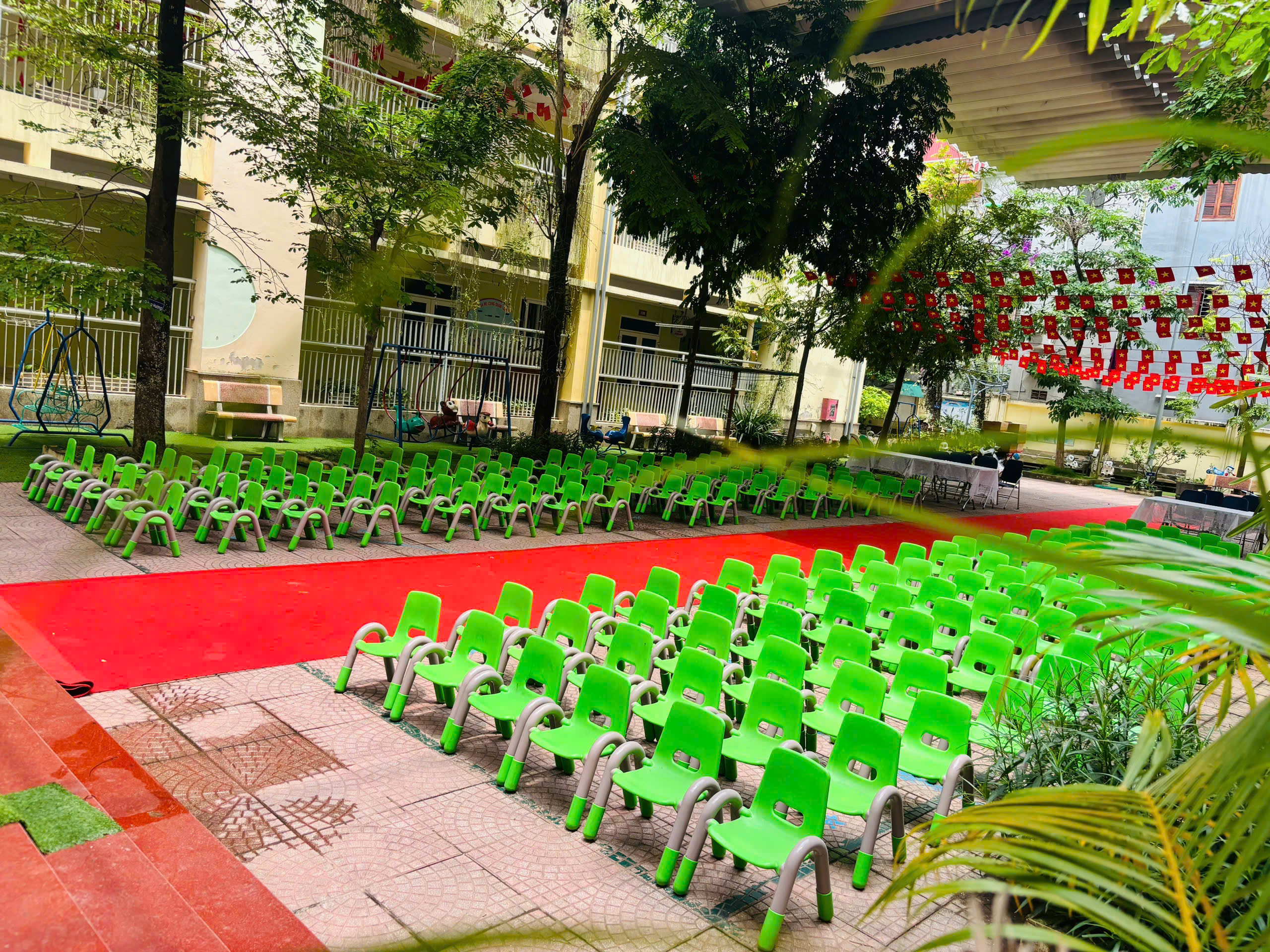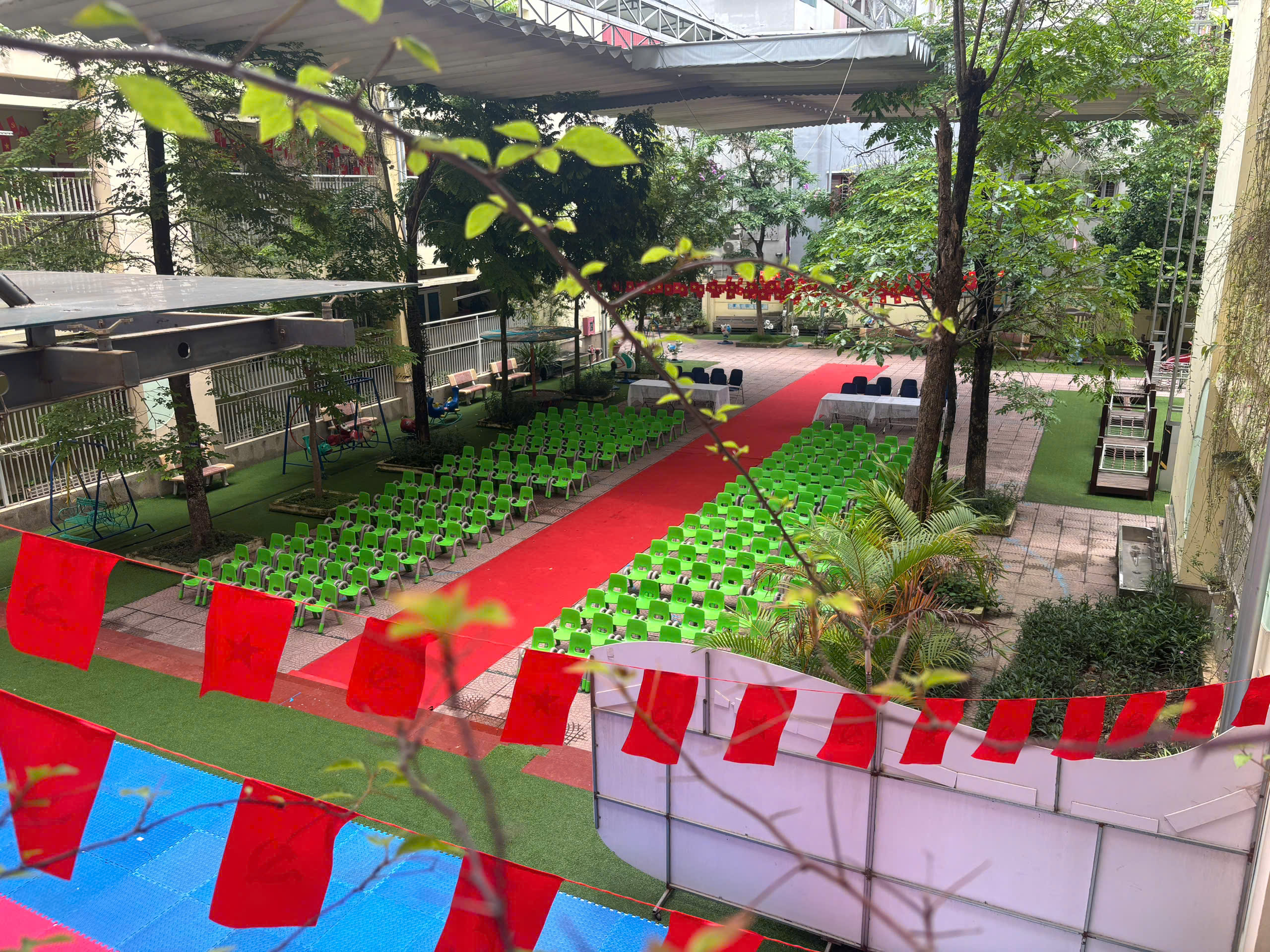 Phông nền rực rỡ, tự hào: Backdrop mang đậm tinh thần của ngày hội non sông đã được dựng lên trang trọng. Từng dải cờ hoa, từng góc tiểu cảnh trang trí đều được chăm chút tỉ mỉ, tạo nên một không gian đầy sắc màu và vô cùng ý nghĩa.